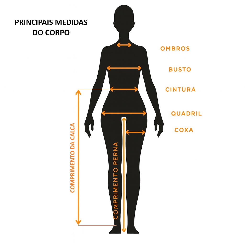 Cintura - Meça a parte mais fina da cintura, localizada cerca de 2 cm acima do umbigo. Mantenha a fita confortável, sem apertar demais.