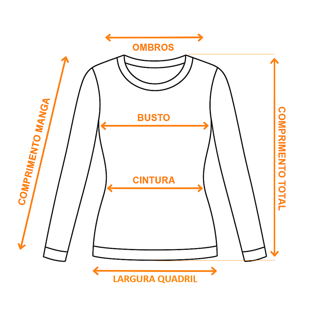 Comprimento Total - deve ser medido do ponto mais alto do ombro até a barra da blusa. Essa medida varia de acordo com o modelo da peça (cropped, regular, alongada etc.) e influencia diretamente no estilo e proporção do look.