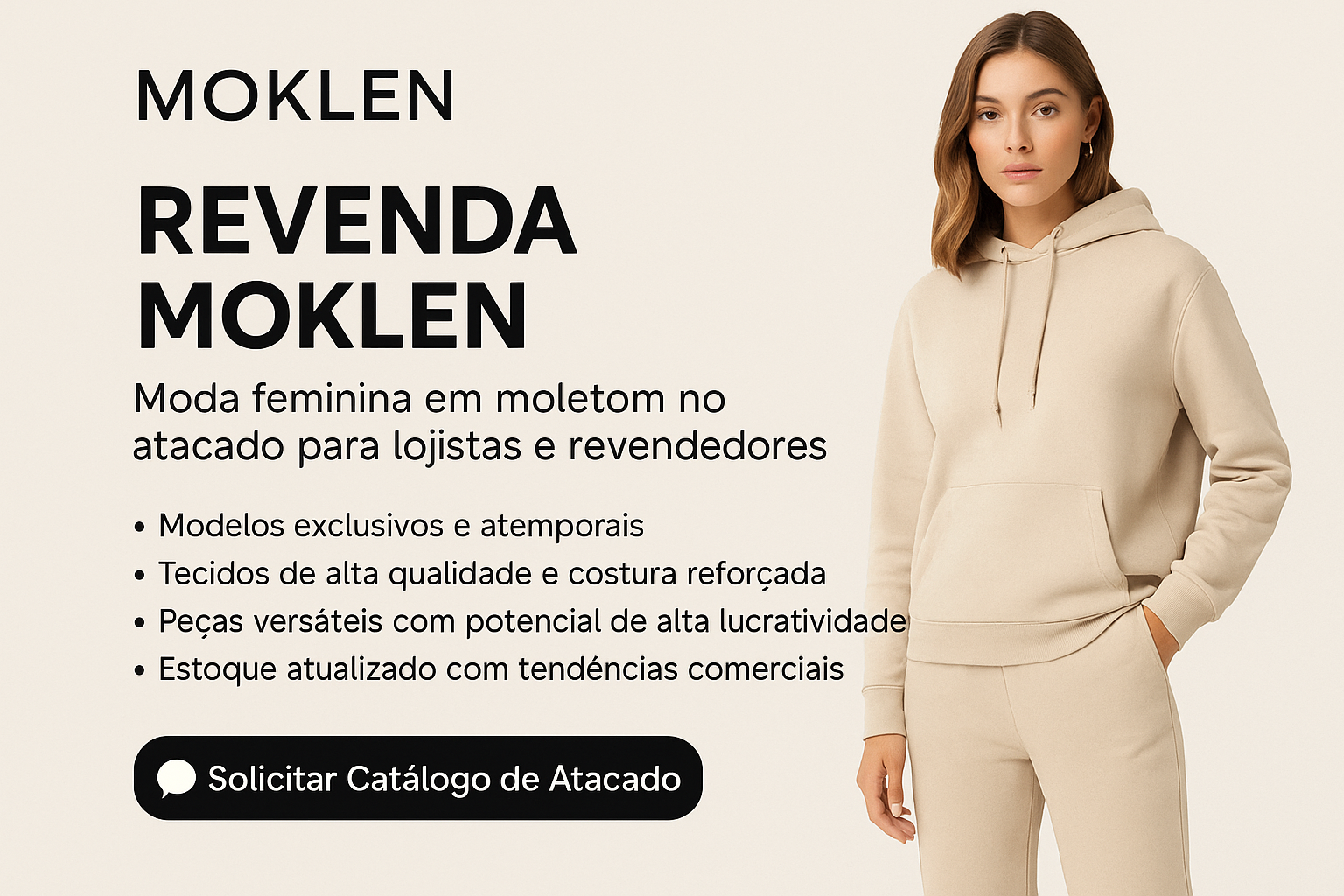 A Moklen é referência em moda feminina feita em moletom e moletinho premium, com modelagens exclusivas, caimento perfeito e acabamento impecável. Produzimos peças que unem conforto, estilo e durabilidade, perfeitas para atrair clientes e gerar alto giro no ponto de venda.
